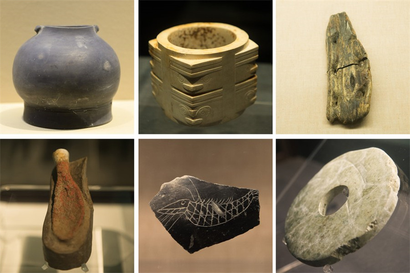从左上起,顺时针方向依次为良渚文化遗址出土的黑陶器、玉琮、木屐、漆器、陶片和玉璧。新华社记者 翁忻旸 摄