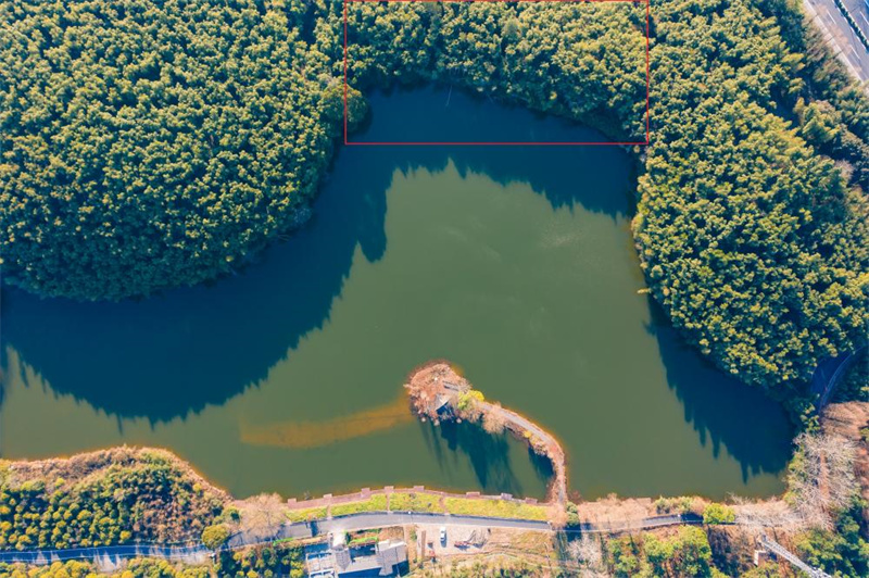红色方框中是良渚古城外围水利工程遗址中的石坞水坝,水坝两侧为自然山体。受访者供图