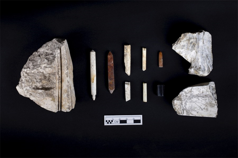 这是从中初鸣遗址群中的王家里遗址出土的玉料、玉锥形器和玉管。受访者供图