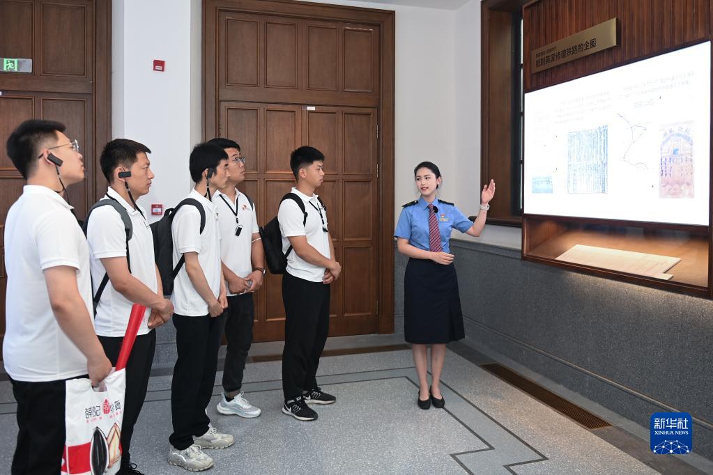 6月30日,嘉兴火车站青年红色宣讲团讲解员(右一)在1921复建站房为游客介绍车站历史。