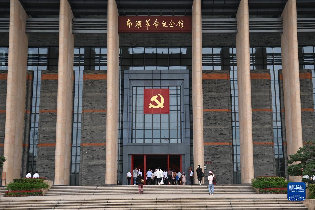 6月30日,游客从嘉兴火车站1921复建站房走出,准备步行沿着新时代“重走一大路”红色旅游路线前往南湖旅游区。