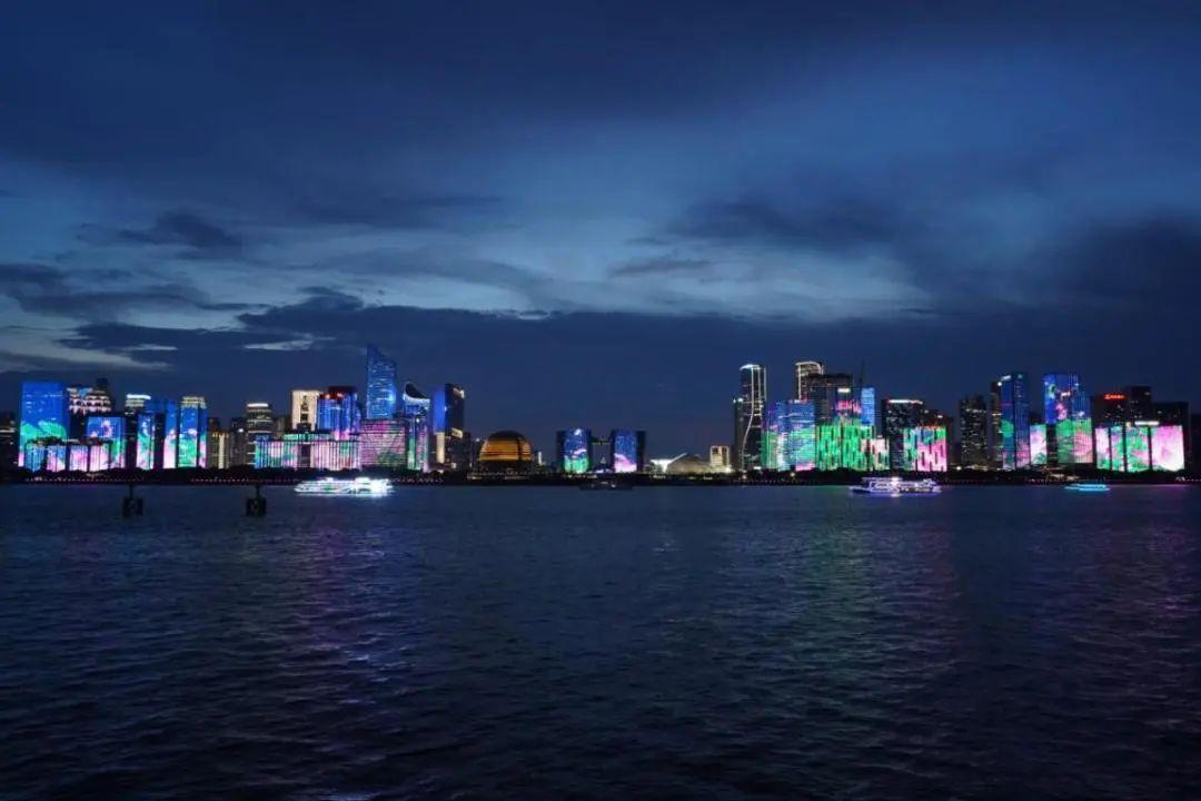 夜幕降临,钱塘江两岸的灯光秀绽放华彩,宛如一幅恢宏的画卷。