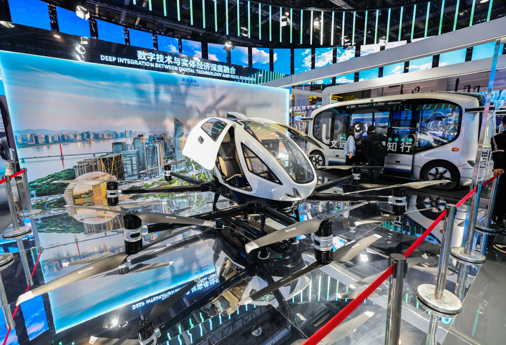 11月23日,在第二届全球数字贸易博览会综合馆内拍摄的飞行器和无人机驾驶汽车。新华社记者徐昱 摄
