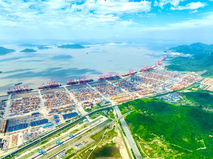 宁波舟山港穿山港区码头一片繁忙景象。2023年1月至10月,宁波舟山港累计完成货物吞吐量11.26亿吨,同比增长6.03%;完成集装箱吞吐量3019.7万标准箱,同比增长4.51%。新华网发 宁波舟山港集团供图