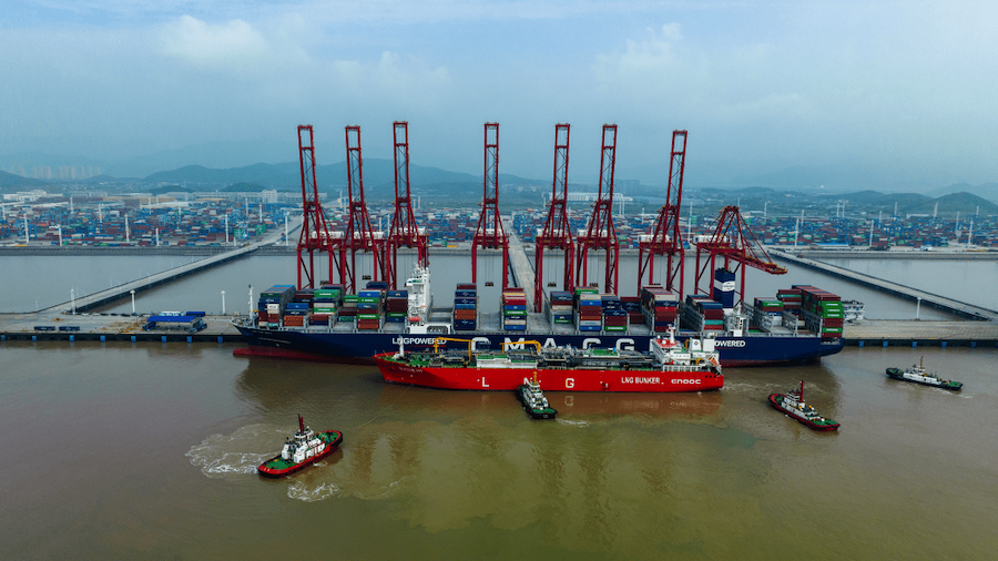 2023年10月,中国石油流通协会发布了2022年“全球十大船加油港口”排名,宁波舟山港保税船燃加注量达602万吨,跻身全球第四大加油港。新华网发 宁波舟山港集团供图