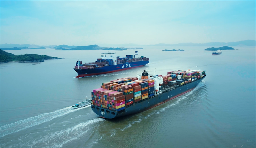 虾峙门航道上超级巨轮往来穿梭不断。2023年以来,宁波舟山港集装箱航线总数稳定在300条以上,其中“一带一路”航线及RCEP航线增至129条,累计完成“一带一路”航班超4600班次。新华网发 宁波大港引航有限公司供图