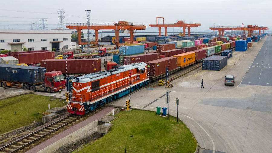 2023年11月,宁波舟山港金华海铁联运首单陆路启运港退税业务完成。2023年以来,宁波舟山港获批作为离境港实施启运港退税政策,成为唯一同时覆盖我国南北沿海和长江干流主要港口的离境港。新华网发 宁波舟山港集团供图