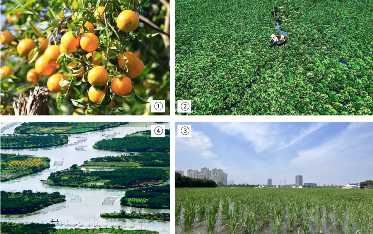 ①瓯柑②黄菱③水稻④稻柑菱共生场景。温州生态园管委会供图
