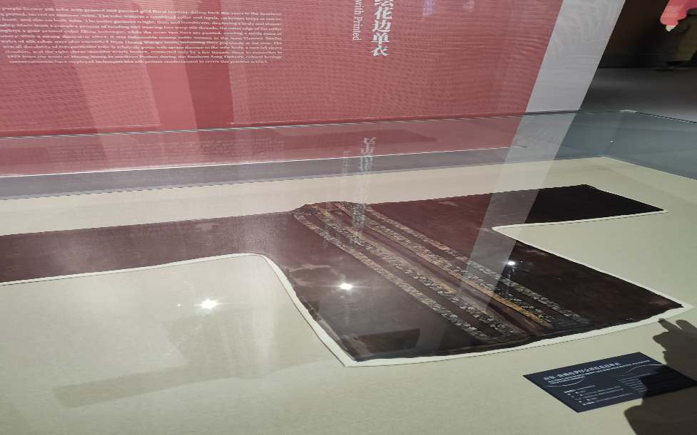 图为在浙江省博物馆之江馆区展出的“南宋紫褐色罗印金彩绘花边单衣”。新华社记者 冯源 摄