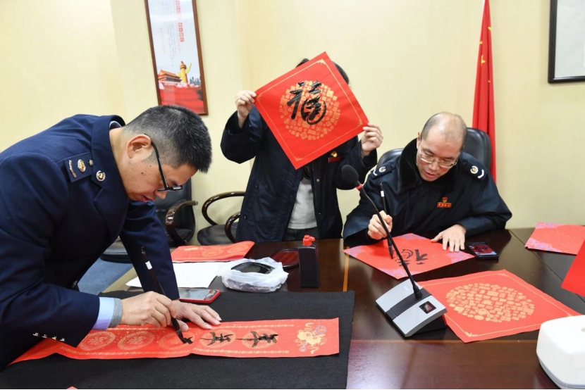 鹿城区税务部门工作人员为纳税人写春联和“福”字。陈东 摄