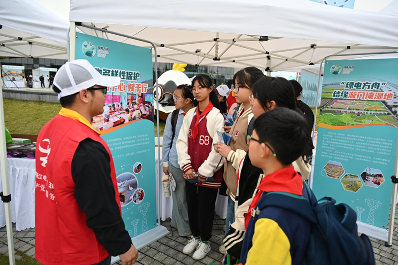 作为活动受邀单位之一,国网玉环市供电公司在开幕式现场就“绿电方舟”项目与漩门湾国家湿地公园因生物多样性保护工作“结缘”的相关情况进行了介绍。据了解,自项目落地漩门湾国家湿地公园以来,国网玉环市供电公司联动当地政府、湿地管理处,努力推动零碳湿地转型,为珍稀鸟类监测实现不间断、可持续绿电供应。开幕式现场,300多名研学学生与近百名游客驻足国家电网宣传展台前,一起观看绿电赋能爱鸟护鸟生物多样性保护工作的玉电实践,分享了生物多样性保护工作的心得和体会。