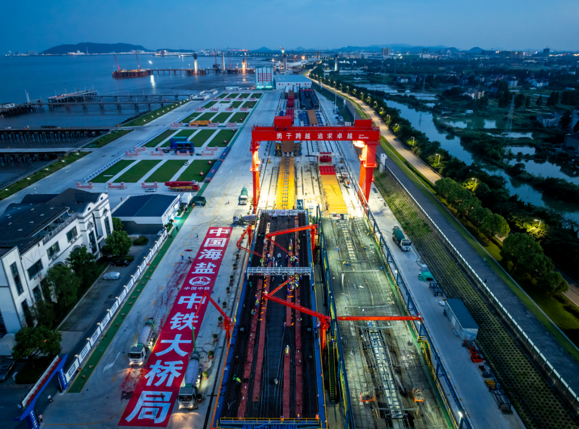 7月9日,世界最长高速铁路跨海大桥——通苏嘉甬高铁杭州湾跨海铁路桥首榀80米跨度预制箱梁开始在浙江海盐浇筑,这是迄今为止世界上跨度最大的预制混凝土箱梁,被誉为新一代“世界梁王”。