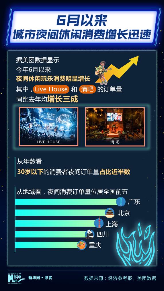 据美团数据显示,今年6月以来,夜间休闲玩乐消费明显增长,其中,Live House和清吧的订单量同比去年均增长三成。从年龄上看,30岁以下消费者订单量占比近半数,成为夜间消费主力军。
