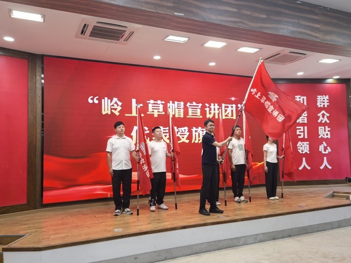省级文化特派员胡逢阳(左三)作为发起人在杭州市淳安县下姜村“岭上草帽宣讲团”成立仪式上接过授旗。