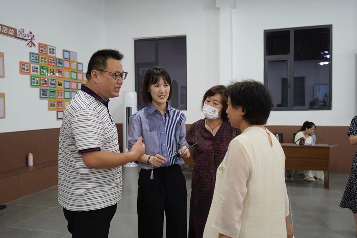 省级文化特派员孙小璞(右三)在海宁市盐官镇祝会村与中国美术学院师生讨论提升村内文化艺术氛围。(本组图片均为受访单位供图)