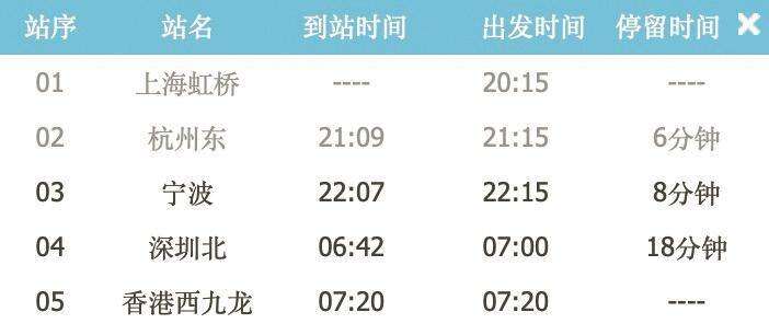 这趟高铁动卧车次号为G899次,首发站为上海虹桥,宁波出发时间为22:15,次日7:20到达香港西九龙站。回程G900次,香港西九龙站20:05发车,次日4:07到达宁波,全程约8小时。