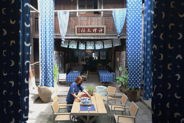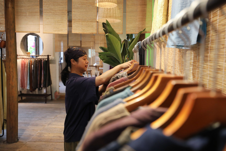 2023年5月23日,在义乌市李祖村,“沙漠的染坊”主理人的母亲在店内整理桌面。新华社记者 杜潇逸 摄