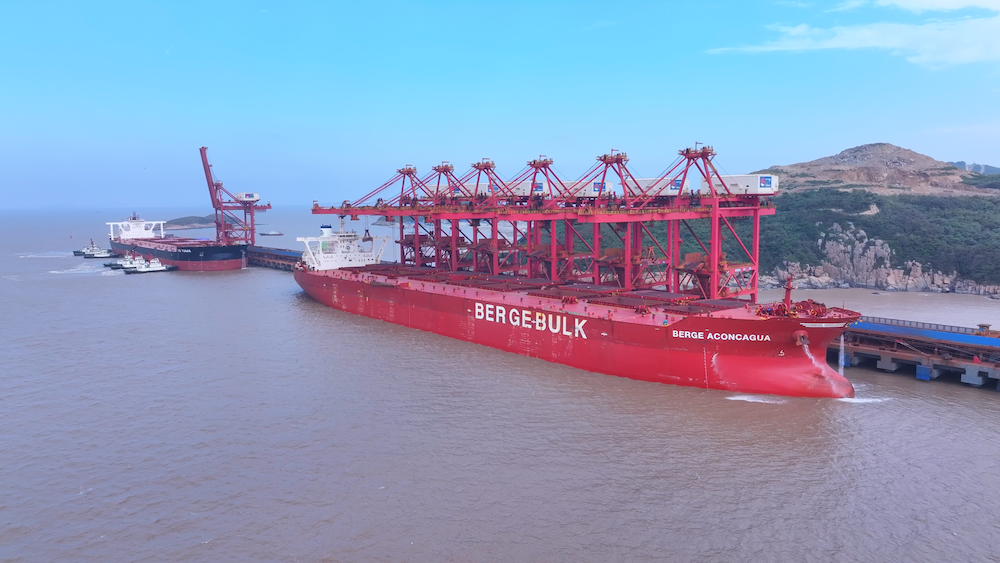 11月21日11时40分,随着最后一根缆绳咬紧缆桩,40万吨矿船“矿石天津”成功靠妥宁波舟山港鼠浪湖矿石中转码头2#泊位,与前一日靠泊1#泊位的另一艘40万吨矿船“阿空加瓜”轮实现“同框”。下午1时半,伴随着矿船鸣笛声响起,7台卸船机把“钢铁巨臂”伸向并排停靠在码头的“双40万吨矿船”,将来自南美洲的铁矿石源源不断地接卸到后方堆场。这标志着宁波舟山港成为全球首个达成双40万吨矿船在泊接卸卸货成就的港口。