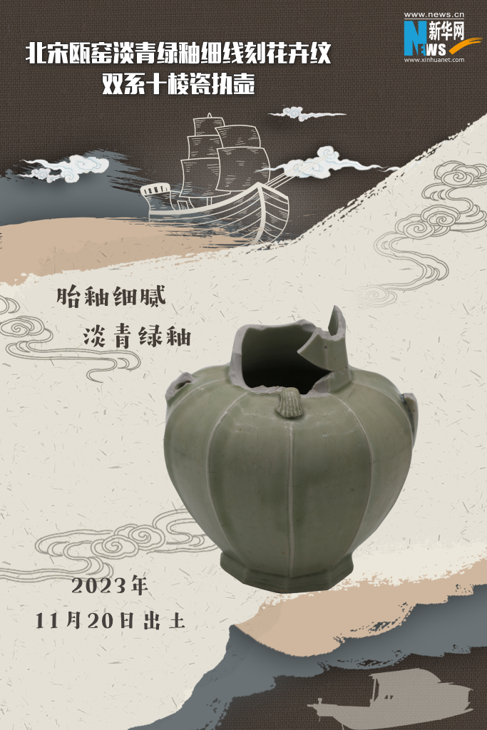 北宋瓯窑淡青绿釉细线刻花卉纹双系十棱瓷执壶