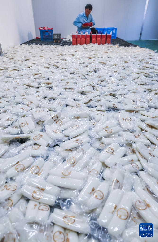 1月2日,在浙江省慈溪市掌起镇东埠头村年糕共富工坊的生产车间内,村民打包水磨年糕,准备发货。