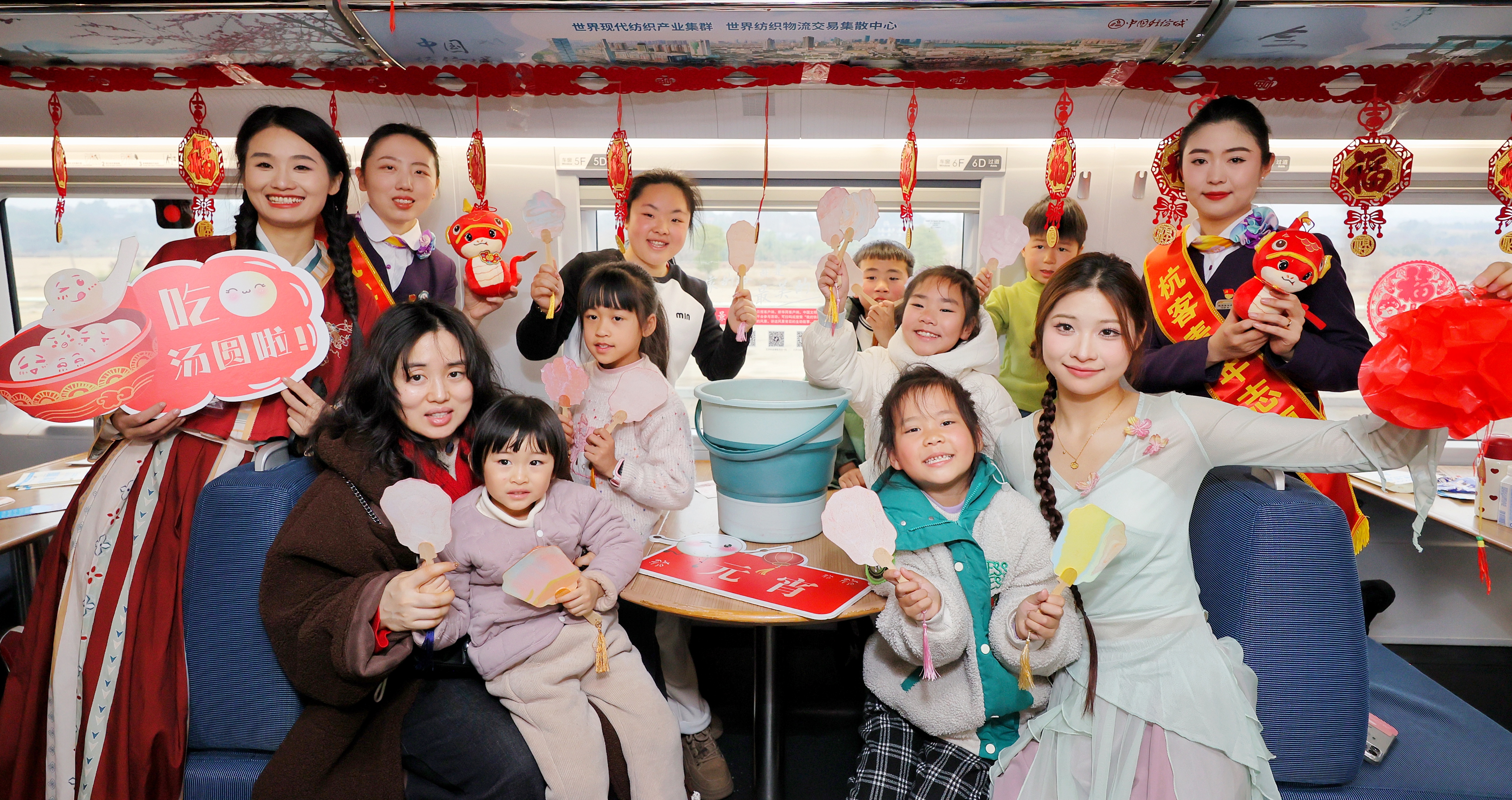 9点19分,列车从杭州东站开出,伴着欢快的音乐,身穿红色汉服的乘务员用踏着青春的舞步向旅客走来,一曲《元宵灯笼舞》喜气洋洋,瞬间点燃现场气氛。旅客们随着节奏摇动身体,沉浸在欢乐中。“二月天杨柳醉春烟,三月三来山青草漫漫......”紧接着歌曲《上春山》响起,优美的旋律伴着窗外快速掠过的风景,将活动推向了高潮。旅客们纷纷拿出手机拍下这难忘的瞬间。