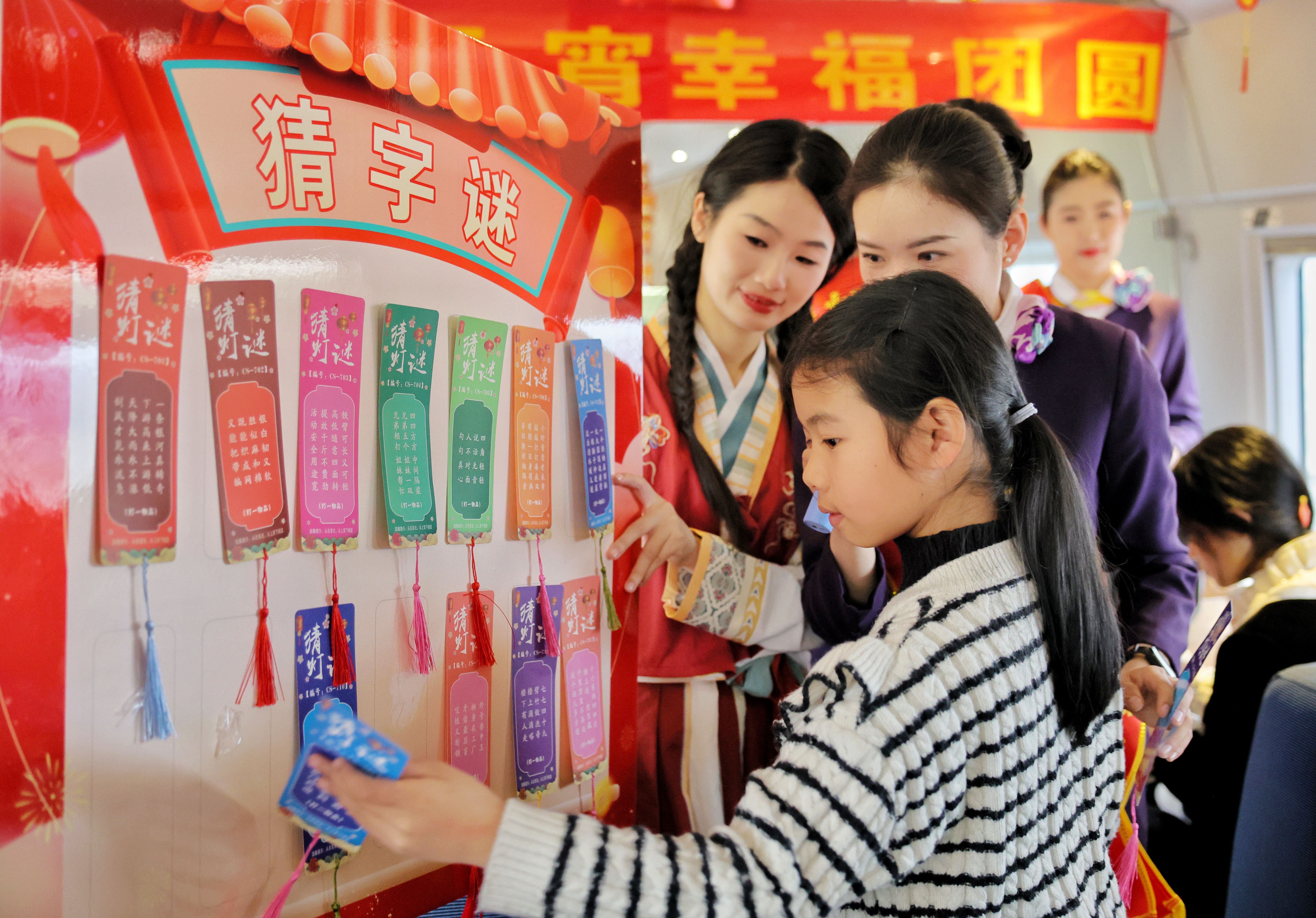随后,乘务员们将灯谜板拿上来,上面五颜六色的卡片上写着一个个有趣的谜面。“送云长上车,打一汉字。”话音刚落,就有旅客举起手来:“连,连长的连。”“答对了!请工作人员送上小礼品。”一盏花灯一场喜,在一问一答中,列车载着欢声笑语一路向前。