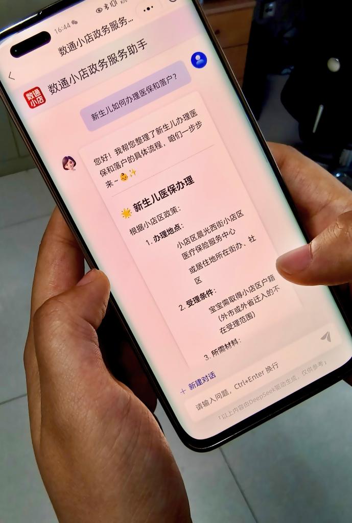 这几天,一款新上线的人工智能政务助手给“准妈妈”吴丽娟帮了不小的忙。宝宝出生后落户、办理医保、疫苗接种时间等信息,在接入DeepSeek的数字管理服务平台“数通小店”上,不到3秒钟就能获得详细答案。