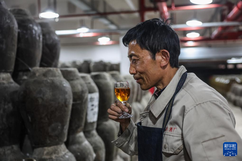 4月16日,在嘉兴南湖区湘家荡农业加工园的老字号企业嘉兴酒厂的地下酒库内,工人在开坛检查年份黄酒的色香味。