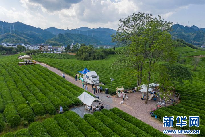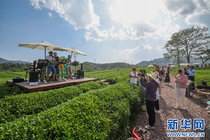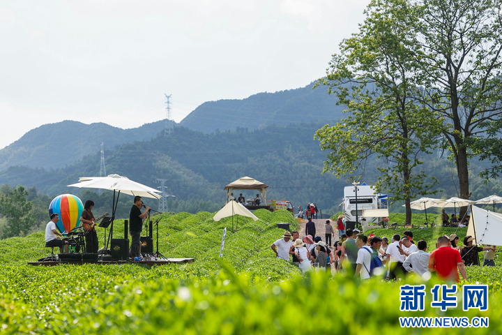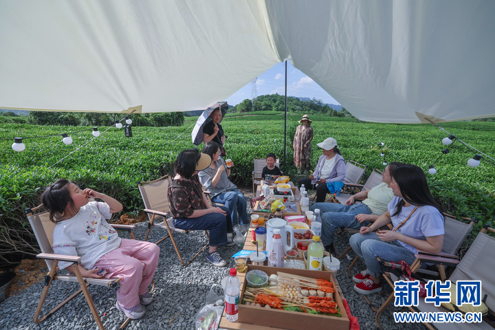 五一小长假期间,浙江省建德市乾潭镇胥江村在千亩茶园内推出农文旅假日消费场景,露天舞台演出、露营烧烤、茶园咖啡、采茶体验等丰富的活动吸引游客前来享受乡村“茶旅融合”的假日生活。