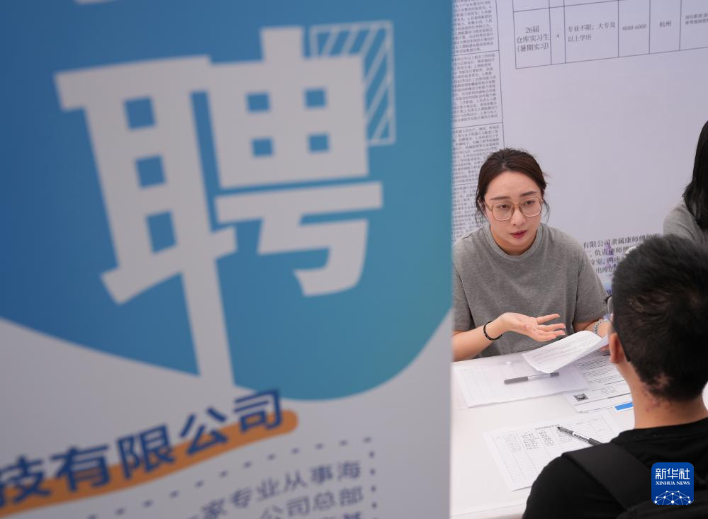 5月13日,一家上市公司的招聘代表(左)在2025杭州市大学生就业·见习招聘会上与前来求职的青年学生交流。