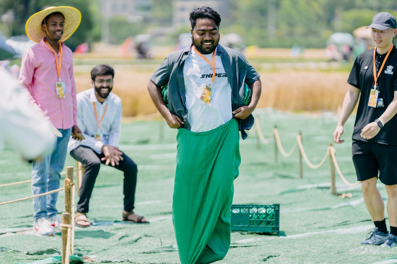赛场上,充满趣味的袋鼠运瓜农耕项目率先“点燃”体验官们的热情。大家双腿套进麻袋,双手紧攥两个西瓜模型,化身笨拙又可爱的“袋鼠”,在一蹦一跳中前行。