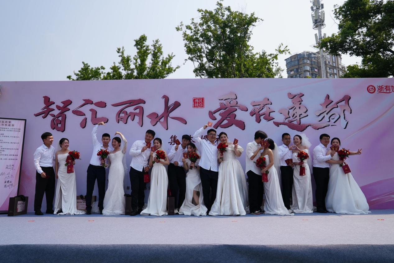 5月27日,“智汇丽水 爱在莲都”集体婚礼活动在浙江省丽水市莲都区举行,8对新人在社会各界的见证下,以简约温馨的仪式开启人生新篇章,用实际行动践行了文明婚俗新礼仪,为推动移风易俗、弘扬文明新风树立了鲜活典范。
