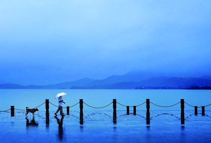 清晨,一名市民带着爱犬在宁波东钱湖畔雨中散步。胡学军摄