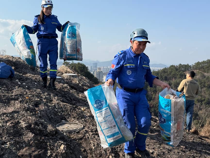 温岭蓝天救援队队员大多是喜欢运动的驴友,攀岩是他们经常训练的项目。2015年3月的一天,蓝天救援队在石夫人景区进行悬崖攀岩训练时,意外发现整个石夫人景区悬崖下垃圾遍布。原本的训练活动随即变成了一次大规模的垃圾清理行动,自此,悬崖垃圾清理成了救援队的常态化公益项目。景区悬崖落差少则几十米,多则百余米。“刚好我们有300余名队员,大多是资深驴友,有丰富的攀岩经验,且都热心公益,所以我们启动了悬崖垃圾清理公益项目,十年来,平均每月组织1-2次悬崖垃圾清理行动,以维持高山景区环境整洁。”温岭蓝天救援队秘书长王青苗说。(张鲜红/文 温岭市太平街道办事处/供图)