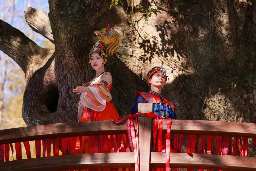 本次活动的另一大亮点,是由浙演·浙江歌舞剧院主创的“让爱川流不息——畲族文化体验式演出”在文成让川民族村精彩上演。演出以“山水相依·文化共脉”为主题,分别于民族村迎宾区、凤凰木表演区和长桌宴互动区,通过《迎客畲乡》《恋上让川》《凤羽福彩》《一眼万年》《让你来》等节目,融合畲歌、迎宾酒、打糍粑、织彩带等文化元素与山水意象,以音乐、舞蹈、戏剧和民俗互动,展现畲族文化、侨乡情感与自然底蕴的交融。