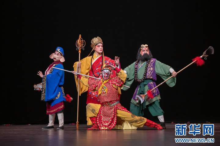 2025年9月25日,在刚果(金)首都金沙萨的金沙萨中部非洲文化艺术中心,浙江婺剧艺术研究院的演员们表演婺剧《三打白骨精》。新华社记者 郑扬子摄