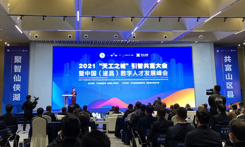 2021“天工之城”引智共富大会暨中国(遂昌)数字人才发展峰会5日在浙江遂昌举行。两院院士、高层次人才、企业家等140余名代表通过“线上+线下”形式,围绕“聚智仙侠湖 共富山区县”主题,就数字经济、数字人才、乡村振兴、共同富裕等话题展开深度交流,共话山区县跨越式高质量发展之路。