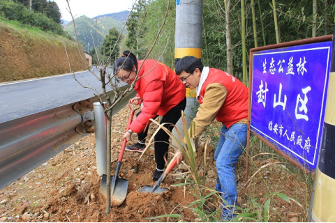 青年志愿者在生态公益林植树。
