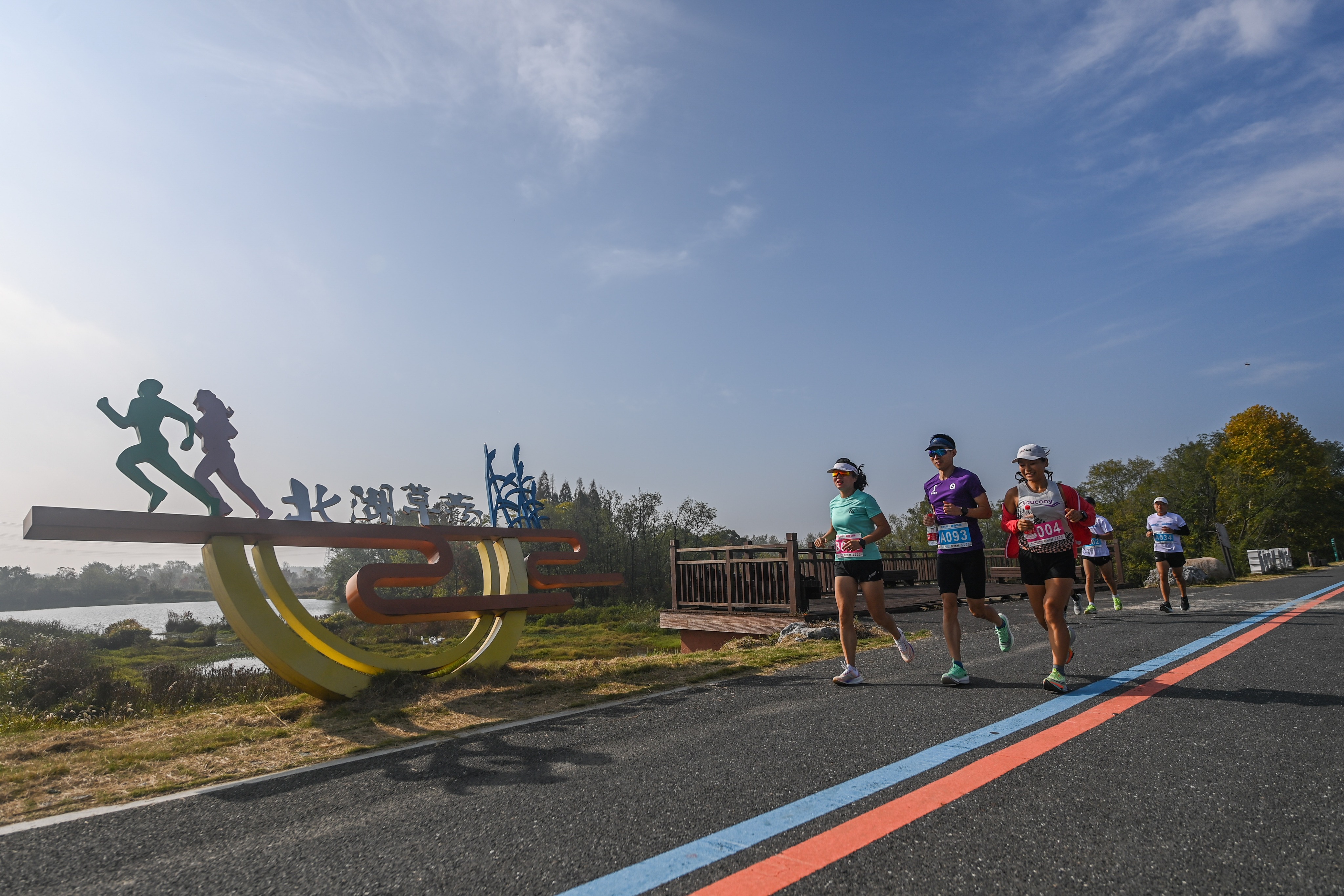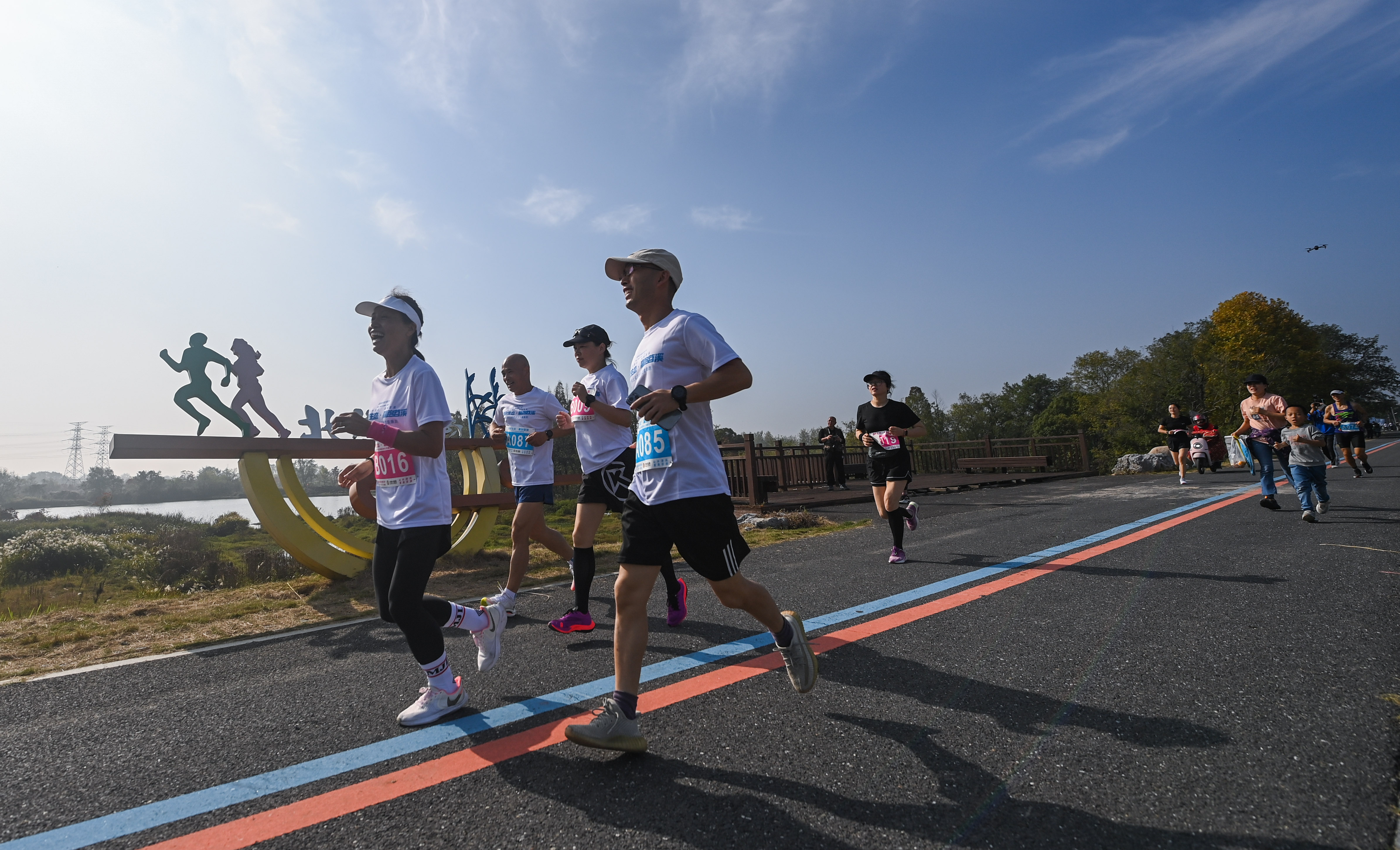 11月12日,运动爱好者们在北湖草荡生态湿地的健身游步道上参加健康跑比赛。