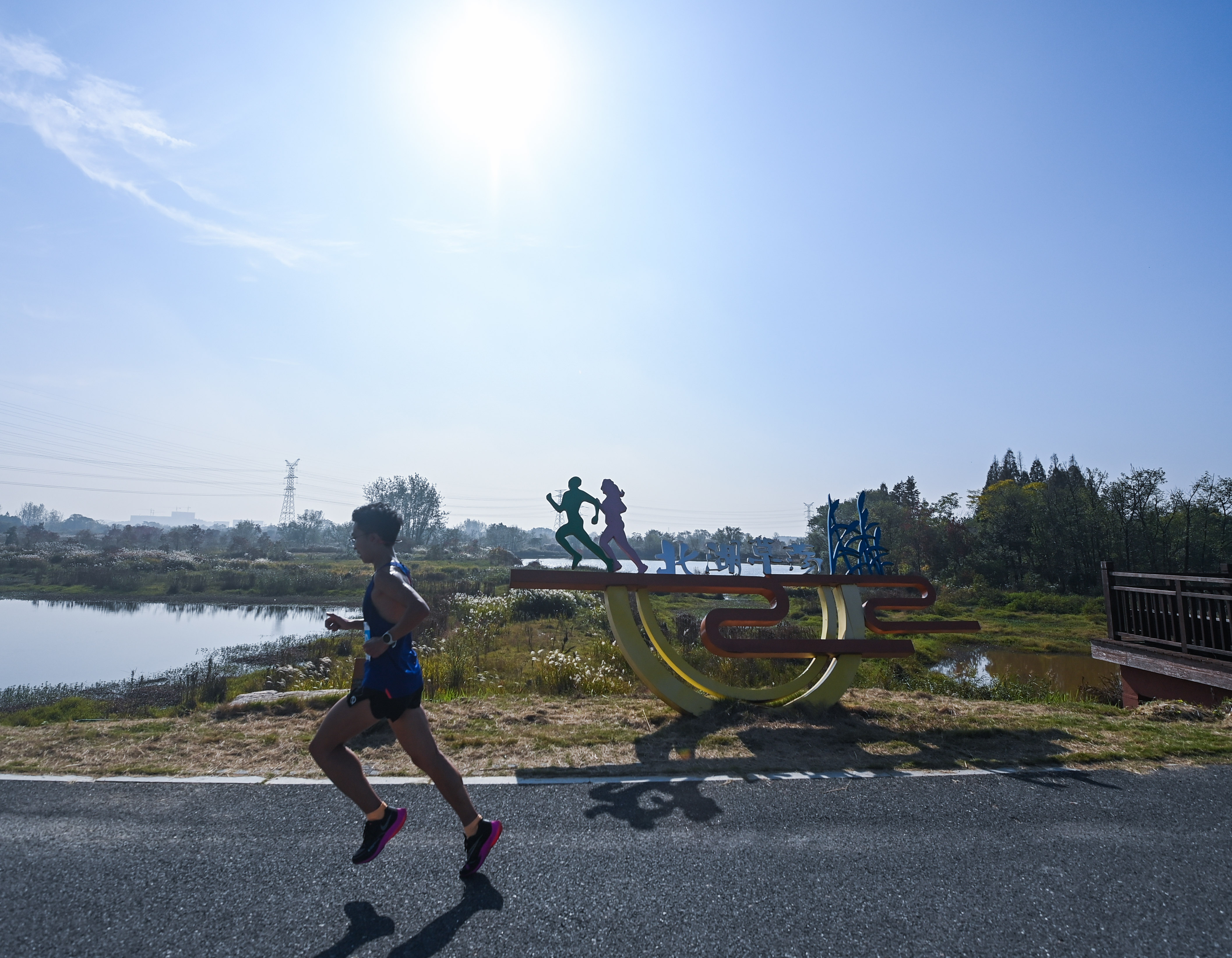 11月12日,一名运动爱好者在北湖草荡生态湿地的健身游步道参加健康跑比赛。