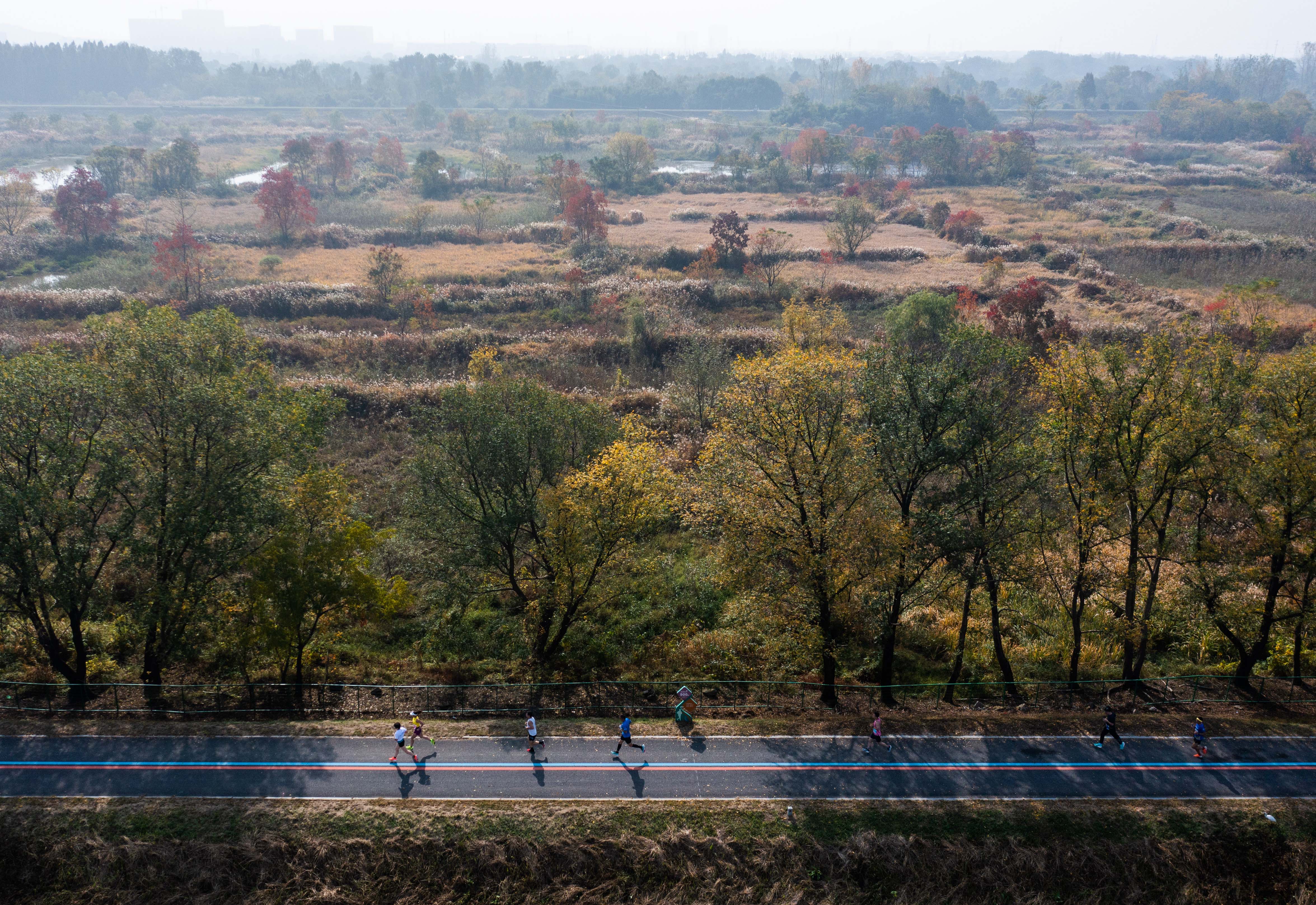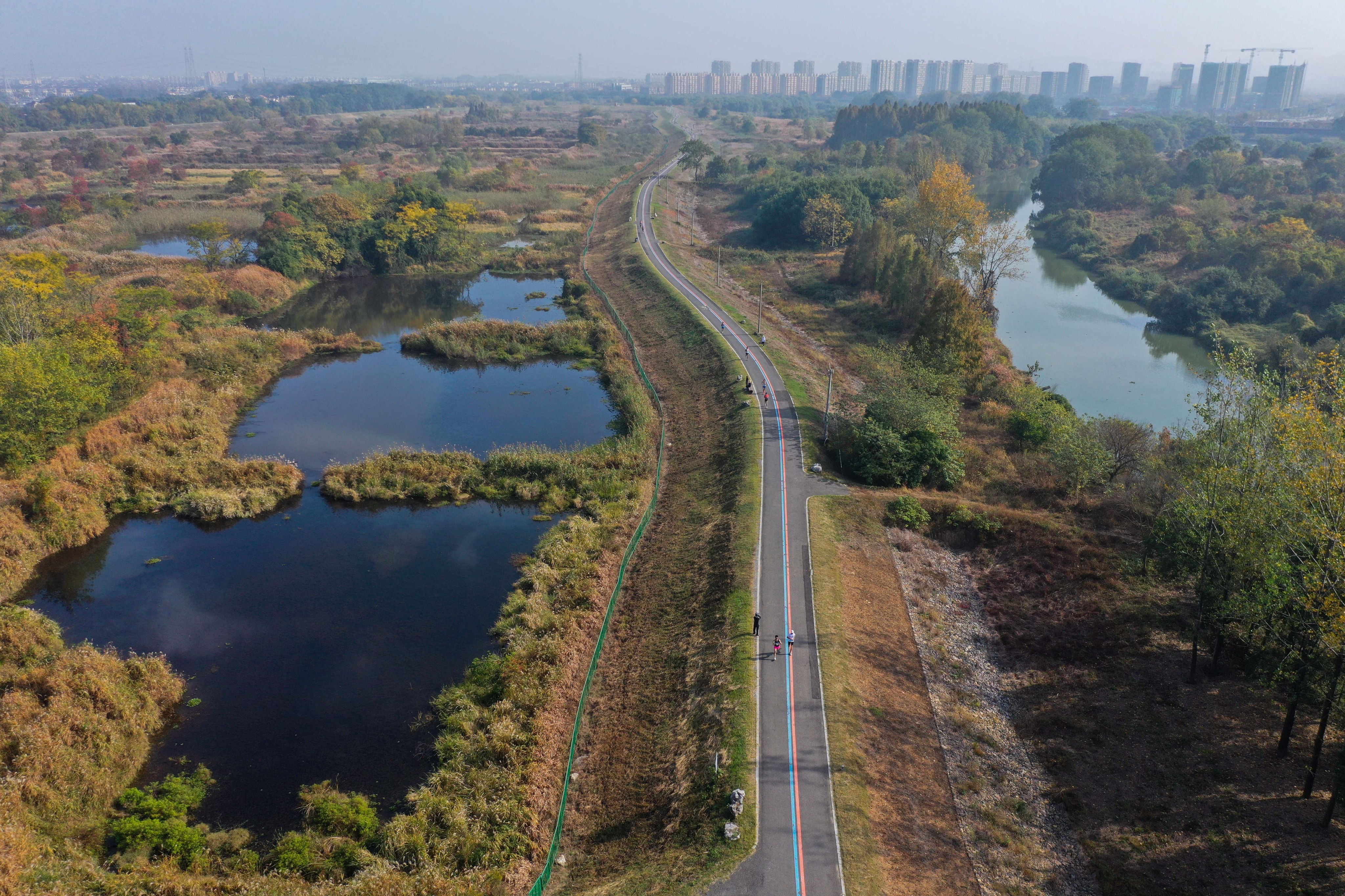 11月12日,运动爱好者们在北湖草荡生态湿地的健身游步道上参加健康跑比赛(无人机照片)。