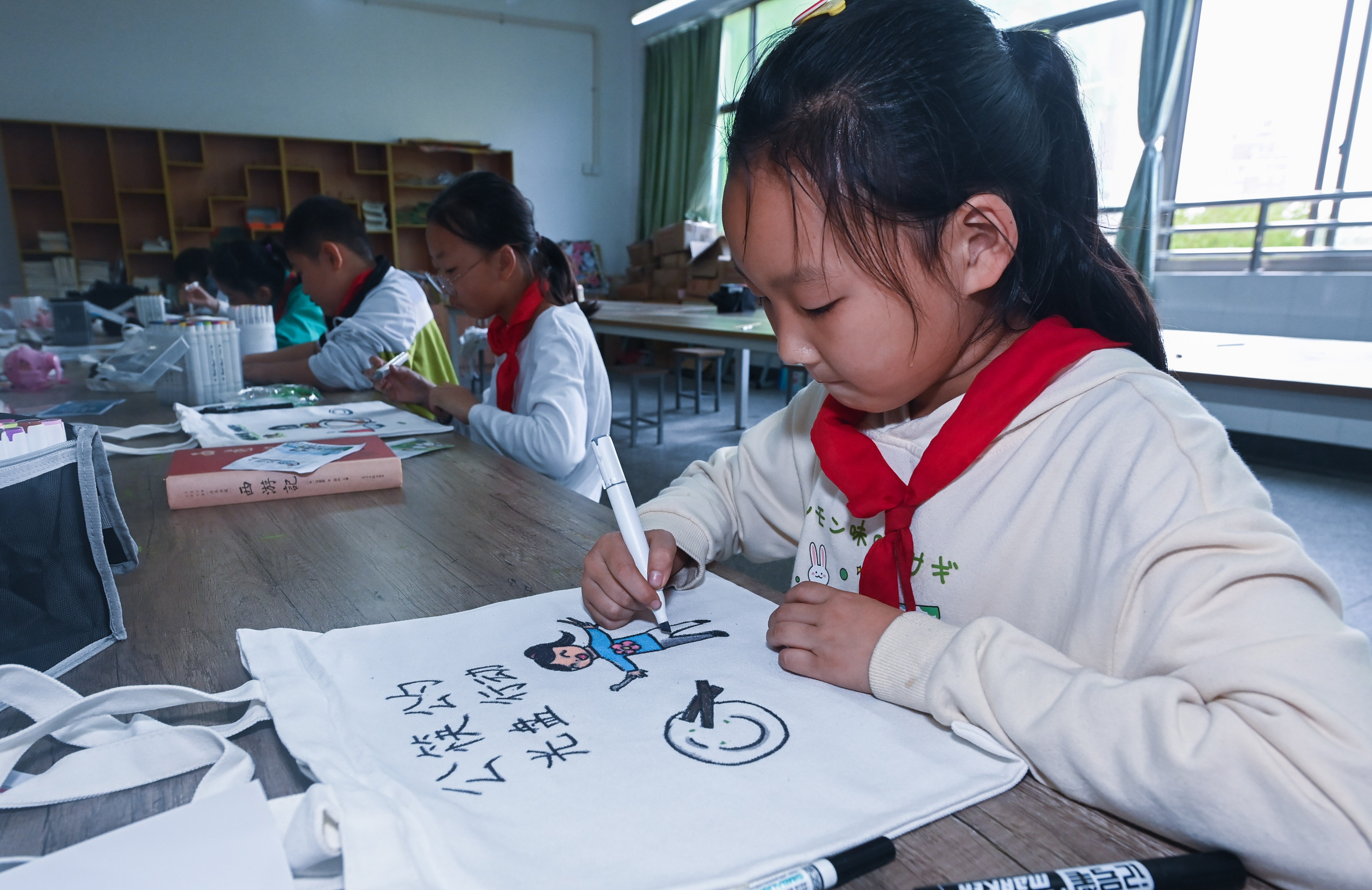11月11日,嘉兴市省身教育集团光明小学美术社团学生在环保袋上绘制宣传画。