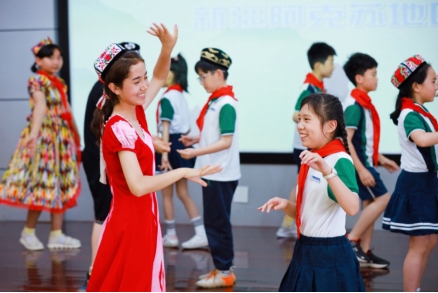 绍兴市群英小学与新疆白玉兰小学进行连线,线上线下,老师同学们载歌载舞,同台展示才艺。此外,群英小学还开展了以“创新有我 梦想传承”为主题的民族文化风情节。