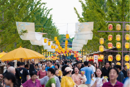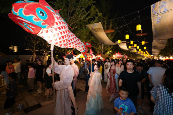 大集沿遗址公园中轴线两侧排开,由竹屋、油纸伞、竹编灯笼等共同组成的集市摊位古韵十足,《千里江山图》和《清明上河图》两幅帷幔飞贯集市南北,更增添了一丝宋韵。通过将“中国历代绘画大系”中的宋画、端午习俗、粽子香囊集市、非遗民俗等融合,端午大集让群众拥有更多可知、可感、可及的体验体验。