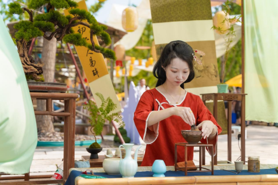 将茶粉投入茶盏,然后倒入沸水,随即用茶筅快速击打出泡沫……在端阳大集特设的宋韵四雅沉浸式体验区,36岁的嘉兴市民陈波就亲身体验了一次被誉为宋韵四雅之一的点茶。他说,自己在三四年前迷上了宋韵文化,一到端阳大集就有种恍若穿越的感觉。
