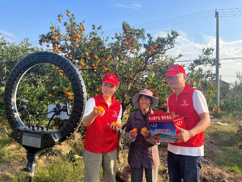 志愿者在澉浦村南北湖柑橘种植基地直播带货。 海盐县烟草专卖局供图