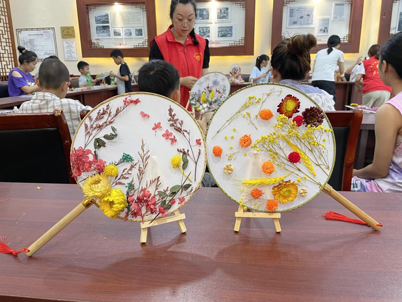 活动现场,志愿者们向参与活动的小朋友们介绍团扇的文化底蕴,并带领他们动手制作。