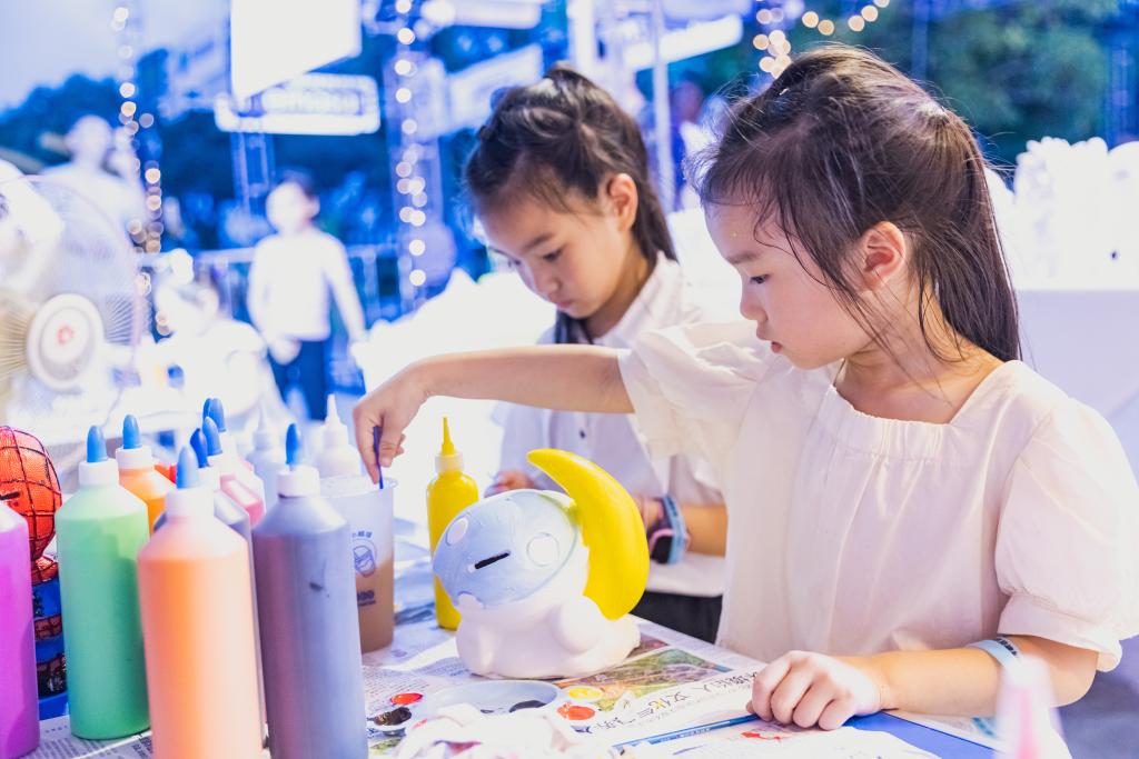小朋友们在2023温州湾新区金海湖·星光集市节的摊位前给玩偶上色。新华网发 温州市龙湾区委宣传部供图