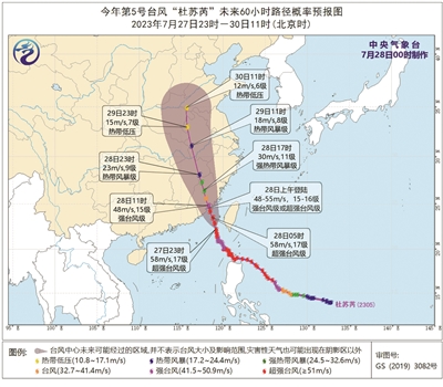 据中央气象台消息,截至今天0时,“杜苏芮”中心位于距离福建省厦门市南偏东方向约250公里海面上,中心附近最大风力17级(58米/秒),以每小时25—30公里速度向北偏西方向移动,强度变化不大,并将于28日早晨到上午在福建东山到莆田一带沿海登陆,登陆时强度为强台风级或超强台风级。