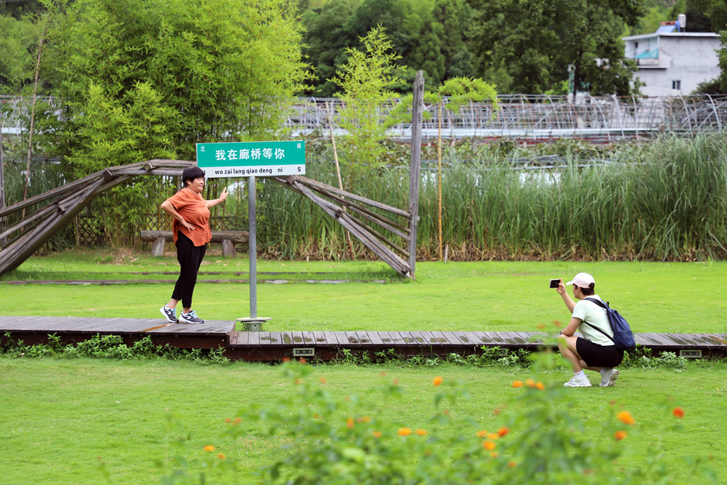 从福建来的游客许女士和家人一同在北涧桥头拍照打卡,感慨万千:“山水田园中的廊桥,美得像梦境一样!以前没有机械和高科技,却有结构如此精巧的桥,足见前人智慧和文化底蕴,而且历经几百年还保护得这么好,真是不容易。”
